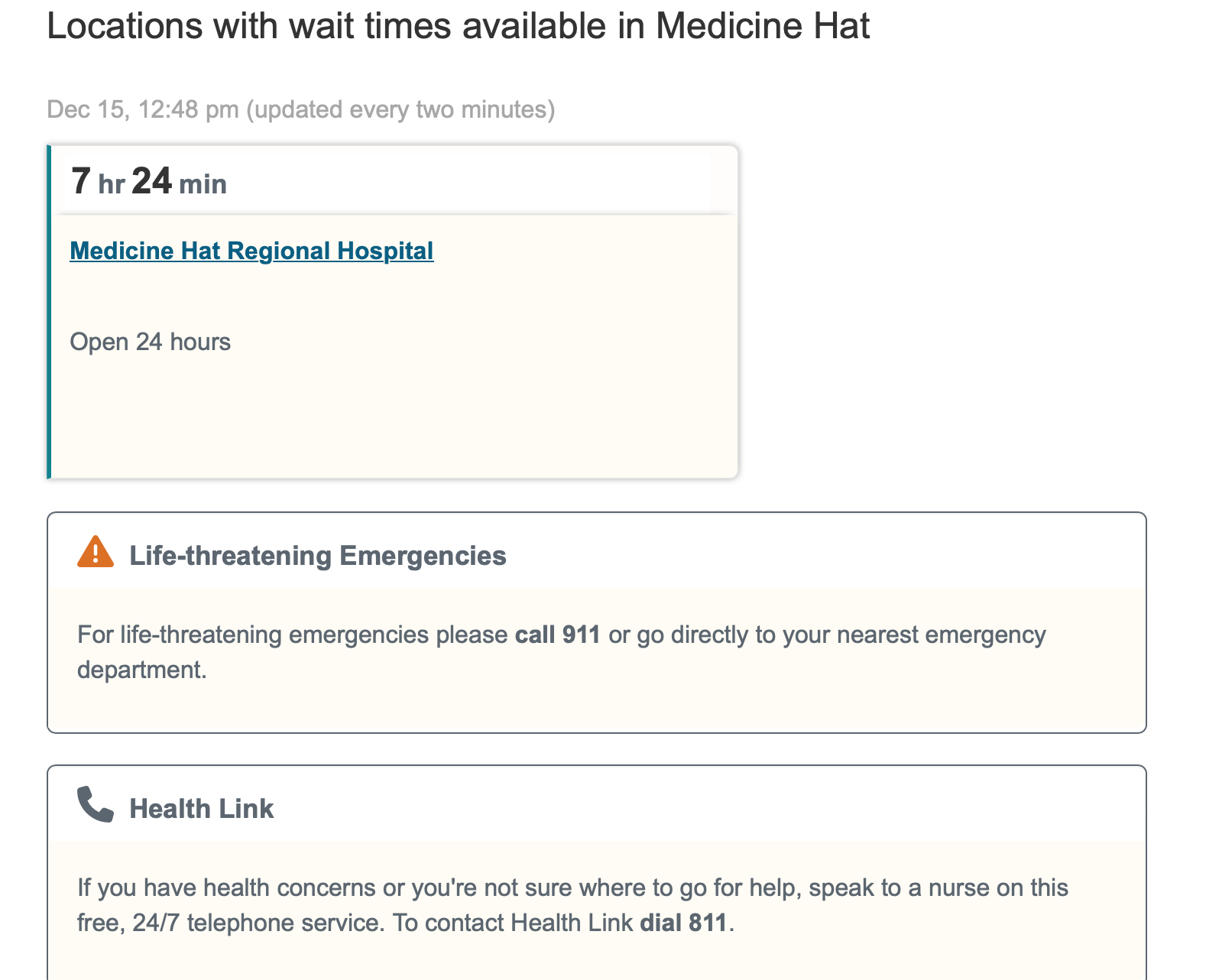 At the time of publication the current wait to see a doctor at the Medicine Hat Regional Hospital was 6 hours, 58 minutes.
