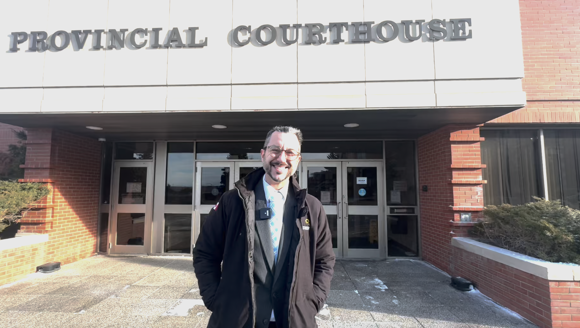 Thomas Fougere outside the Medicine Hat Court of Justice Thursday following charges against him stemming from attempting to cover a public meeting last year were withdrawn. (Photo Alex McCuaig)