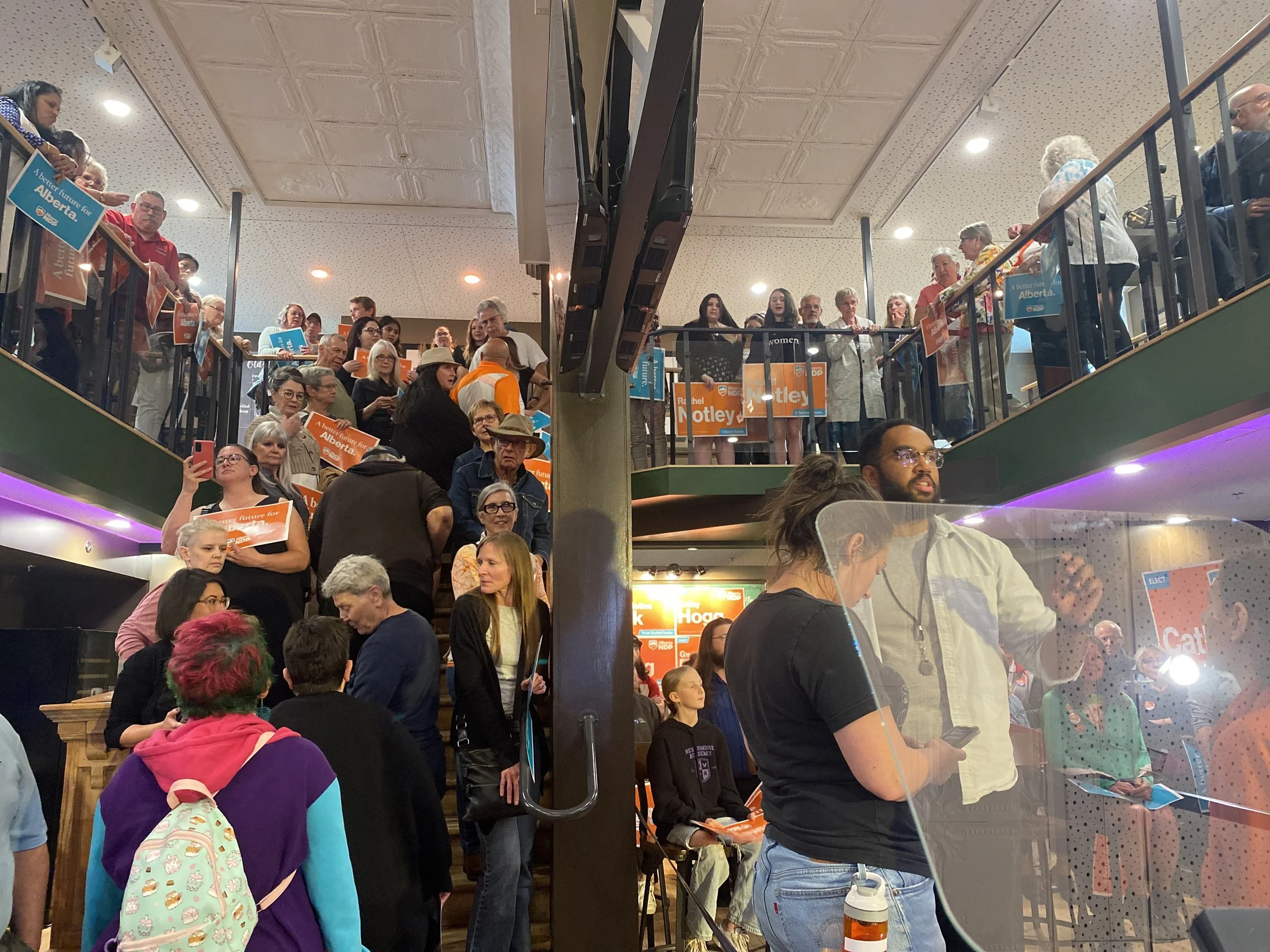 Like Smith, Notley had been out of sight and arrived to cheers. Notley spoke for about 25 minutes. In addition to her platform, she spoke about UCP supporters “lending her their vote”. She spoke about how people shouldn't vote according to a colour, how voters don't owe their loyalty to anybody. Your party of choice should be earning your vote every time.