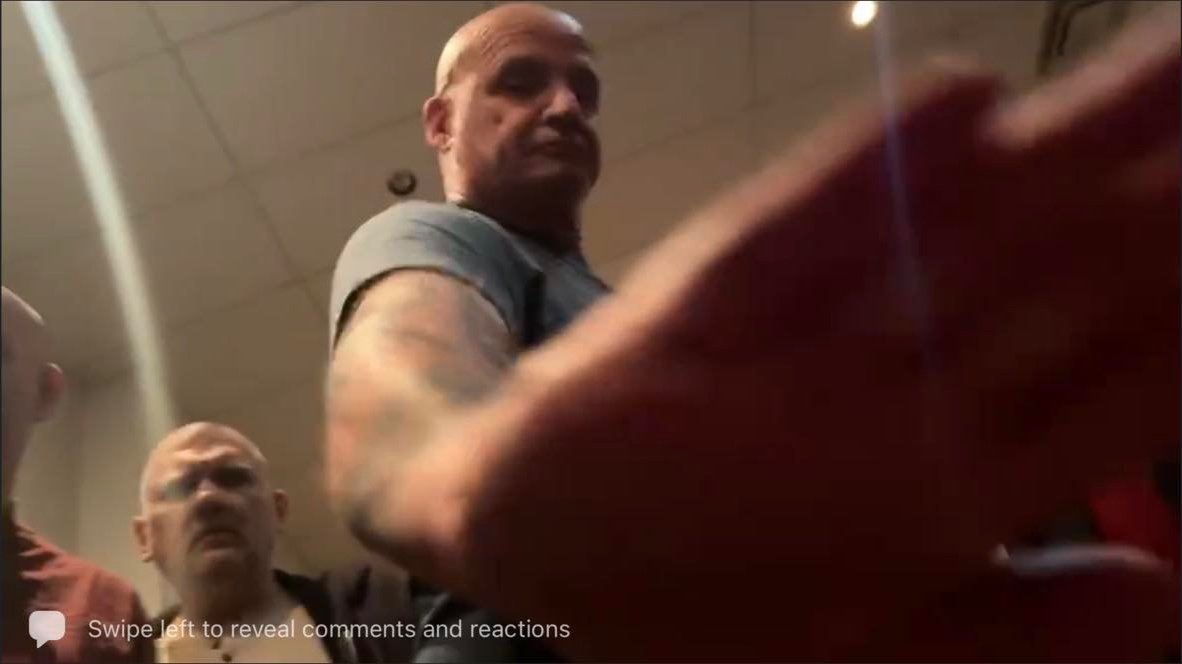A large man comes over and talks to JB, this man was later identified as Tom Coffey (TC) - (former?) Medicine Hat Firefighter. TC tries to block Tom’s camera, then he puts his hand two inches away from Tom’s body.
