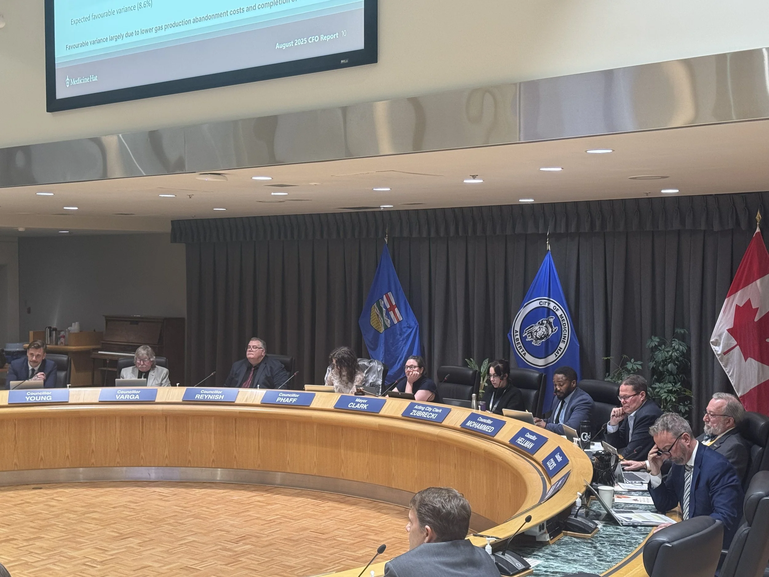 City council during Monday’s meeting which heard some sobering financial data regarding the future of Medicine Hat’s reserve funds and was hit with $32 million in budget amendments for 2026. (Photo Alex McCuaig)