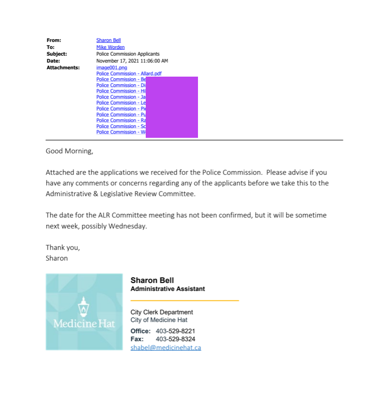 I received a document in my personal FOIP request that showed then Police Chief Mike Worden was sent an email with not only all of the applicant names but also all of the completed applications. It said