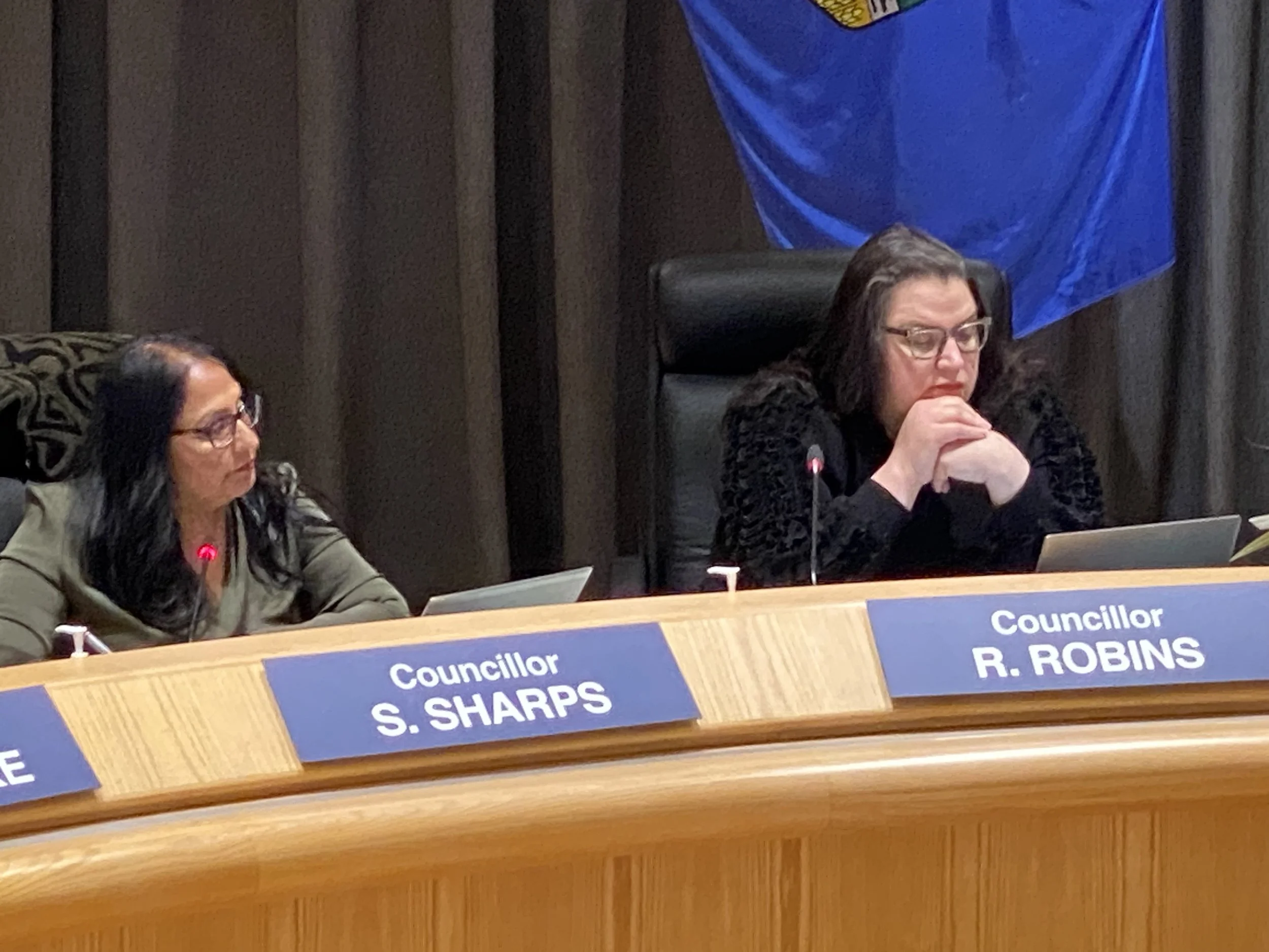 Councillors Shila Sharps and Ramona Robins during a city council meeting last month. (File photo)