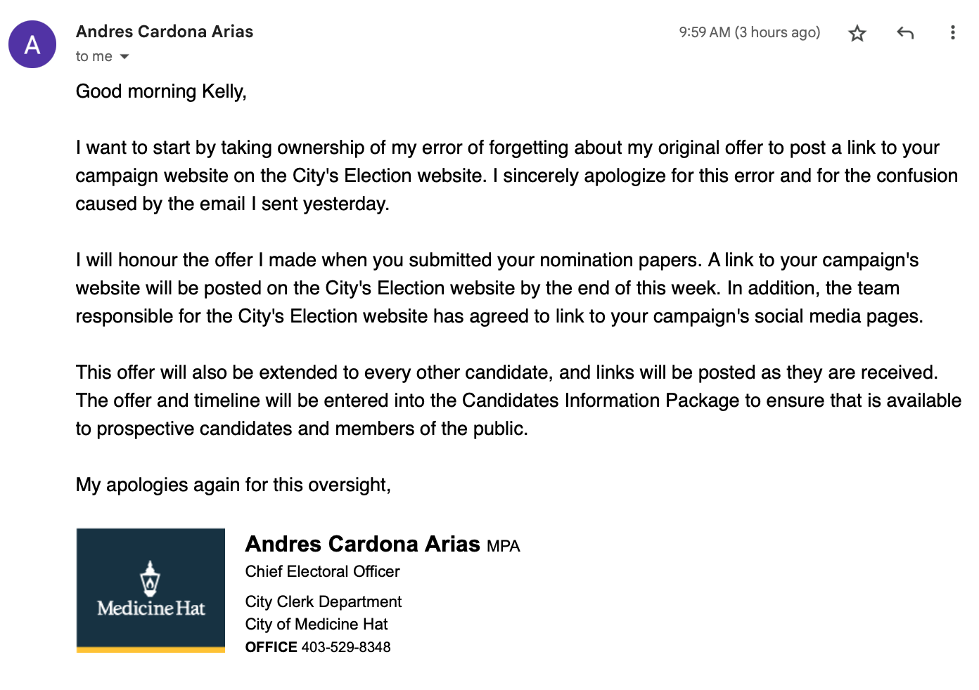 An email was sent out to council candidates yesterday saying that the City of Medicine Hat would publish candidate links to their websites and/or social media on the City of Medicine Hat election page on September 23 2025. This was contrary to what I was promised in March. Chief Electoral Officer Andres Cardona Arias has since corrected the oversight; the Medicine Hat Owl has confirmed that the links will be published as they are submitted, starting this week.