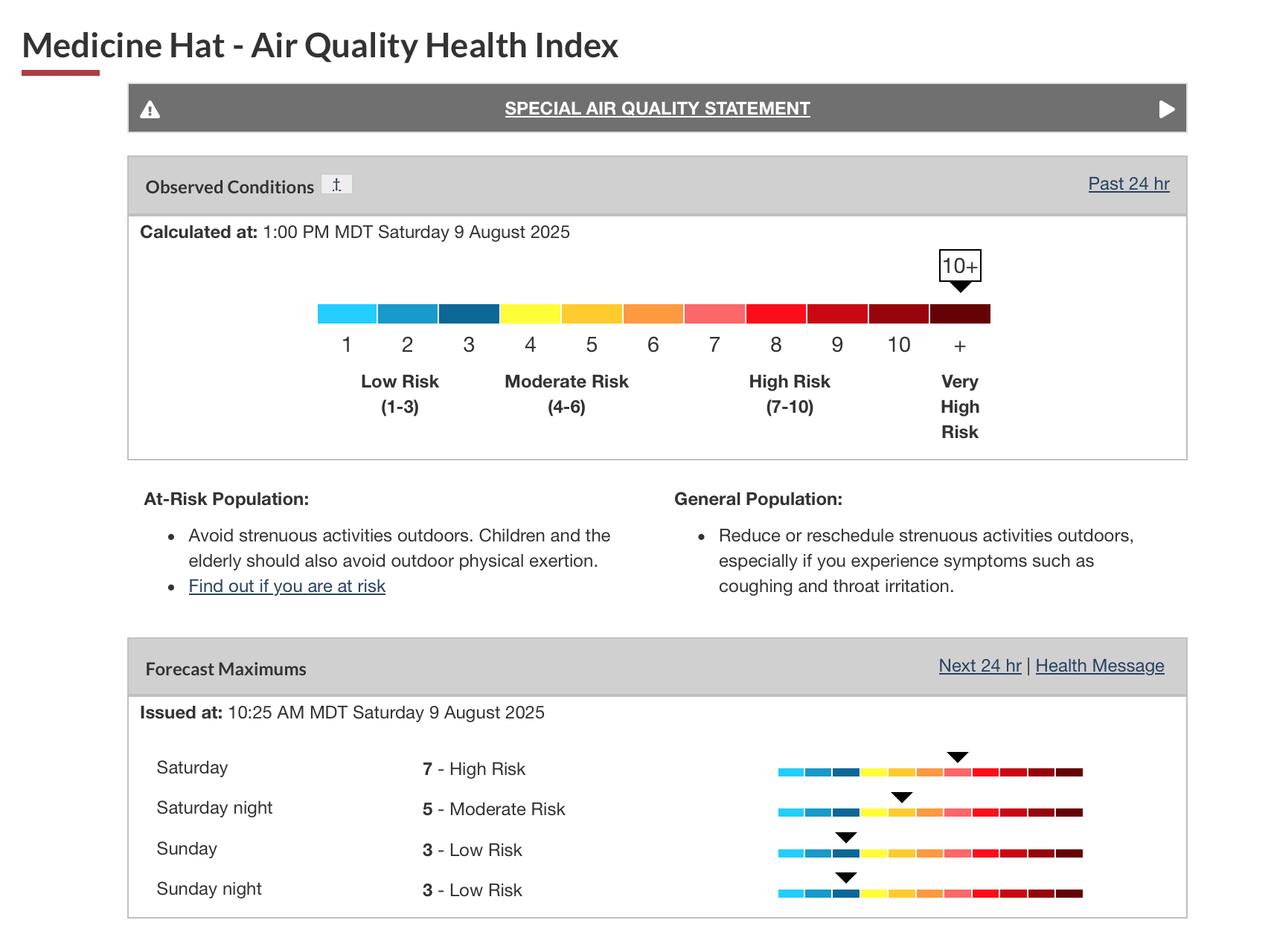 Environment Canada calculates the air quality in Medicine Hat to be 10+ which is Very High Risk. Air quality is forecast to improve overnight and be down to 3 (Low Risk) by tomorrow morning.
