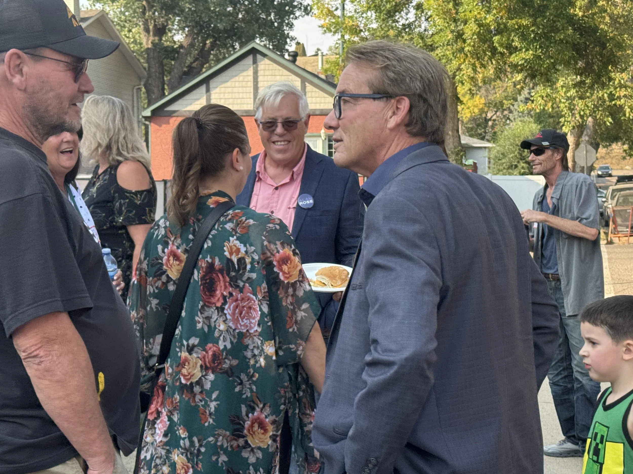 Mayoral candidates Drew Barnes (foreground) and Alan Rose (background) speak with constituents on Wednesday in Riverside. (Photo Alex McCuaig)