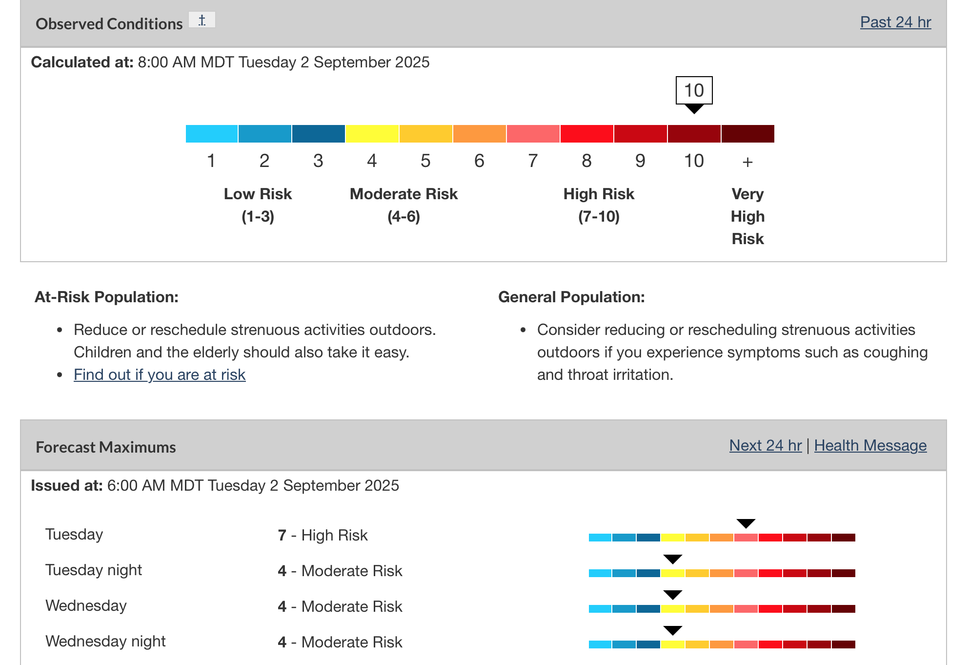 Medicine Hat’s Air Quality is currently at ten out of a scale of 1-10; ranges 7-10 are High Risk . Residents are cautioned to avoid strenuous outdoor activity especially if they have breathing issues. Conditions are expected to improve tonight. (graphic courtesy of Environment Canada)
