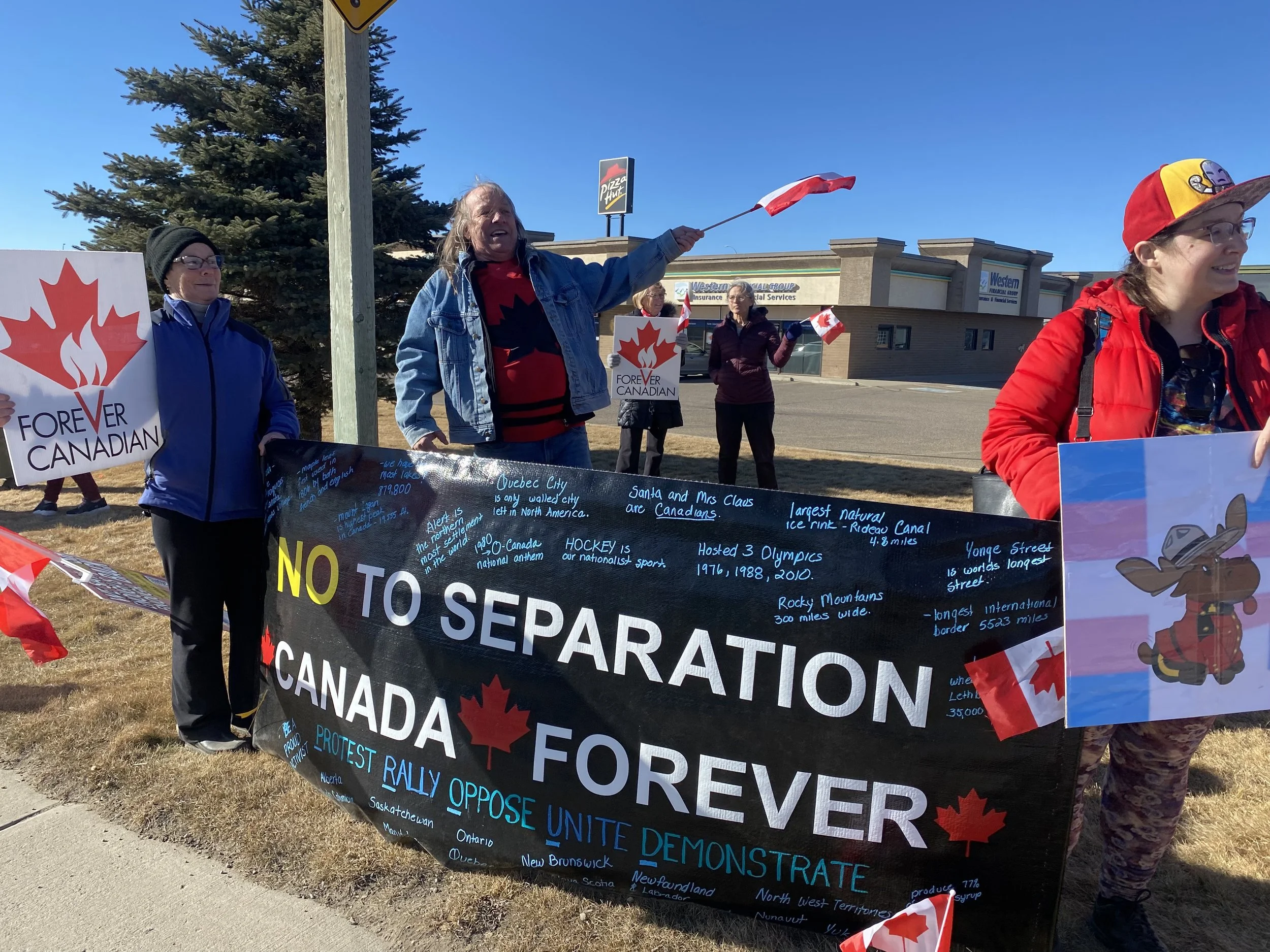A pro-Canada rally outside the constintuency office of MLA Justin Wright on Saturday Feb. 14.