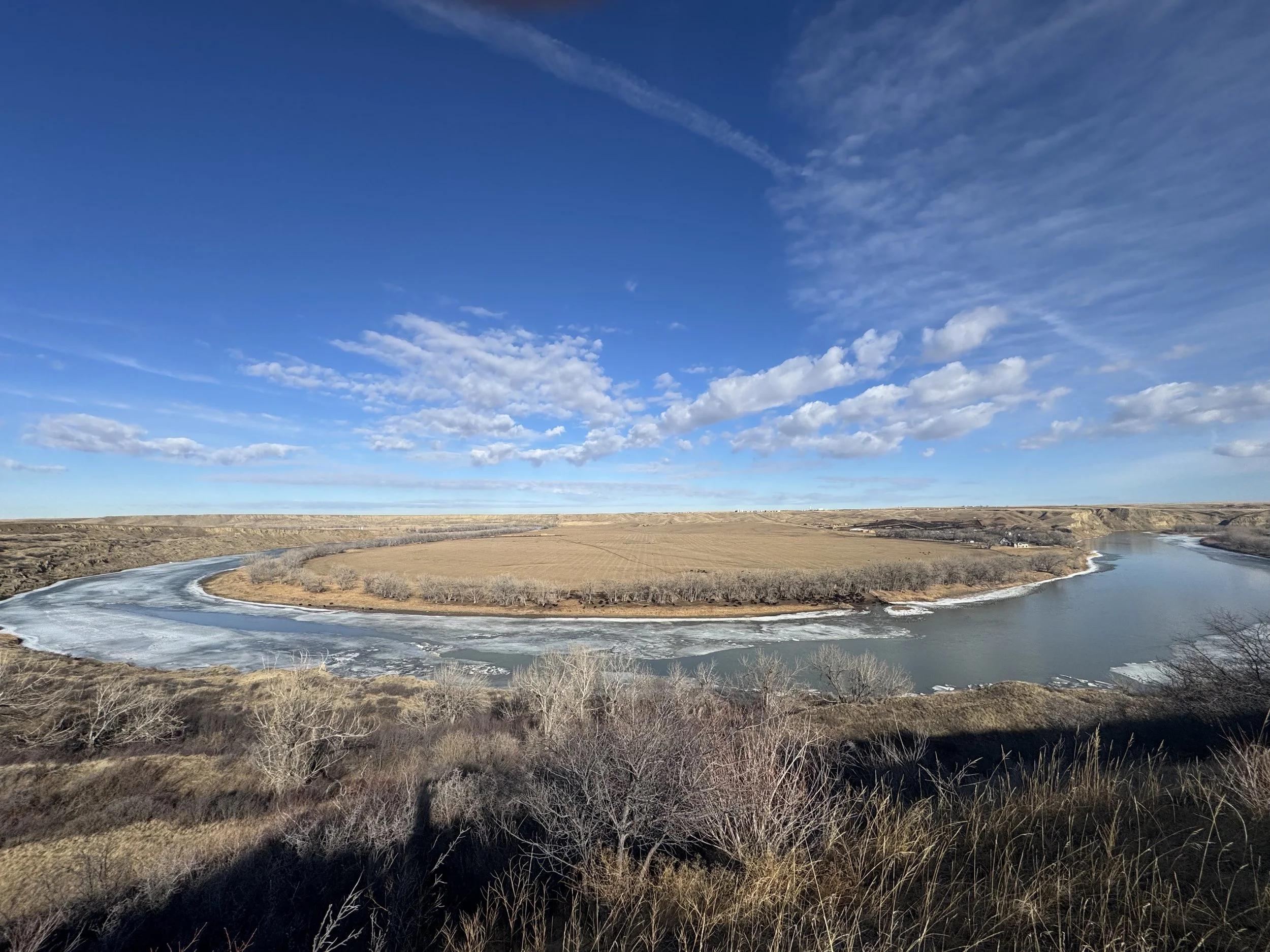 A big sky hangs over a farmers field wrapped by the South Saskatchewan River on Monday Feb. 9, 2026.