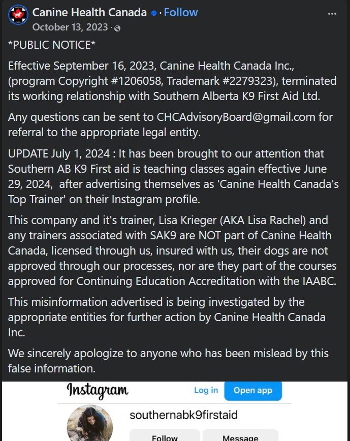 In 2020(?)–2024, Lisa operated Southern Alberta K9 First Aid in and around Medicine Hat. On September 16, 2023, Canine Health Canada Inc. issued a public notice terminating its relationship with Southern Alberta K9 First Aid Ltd. A July, 2024 update stated Lisa Krieger (also identified as Lisa Rachel) and associated trainers were not licensed, insured, or affiliated with them.