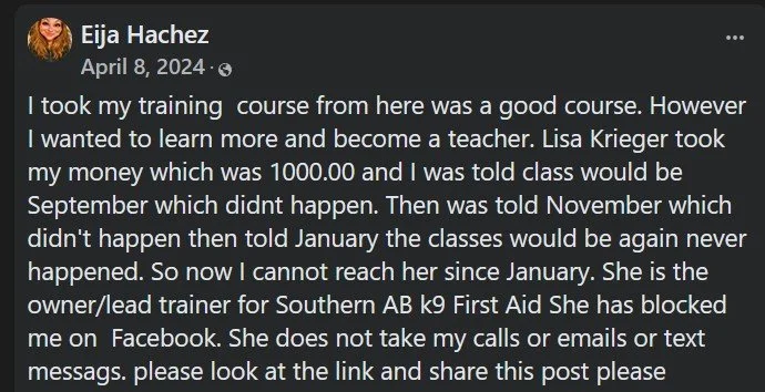 Medicine Hat residents told me, several requesting anonymity, that they paid between $200 and $400 for canine first aid training or dog dental services they allege were not delivered. Some said by the time they realized refunds weren’t coming, credit card dispute windows had expired. This was back in 2023/24, long before, it would seem, Lisa Rachael May Krieger (or whatever her name is) had even dreamed of owning a hockey team.