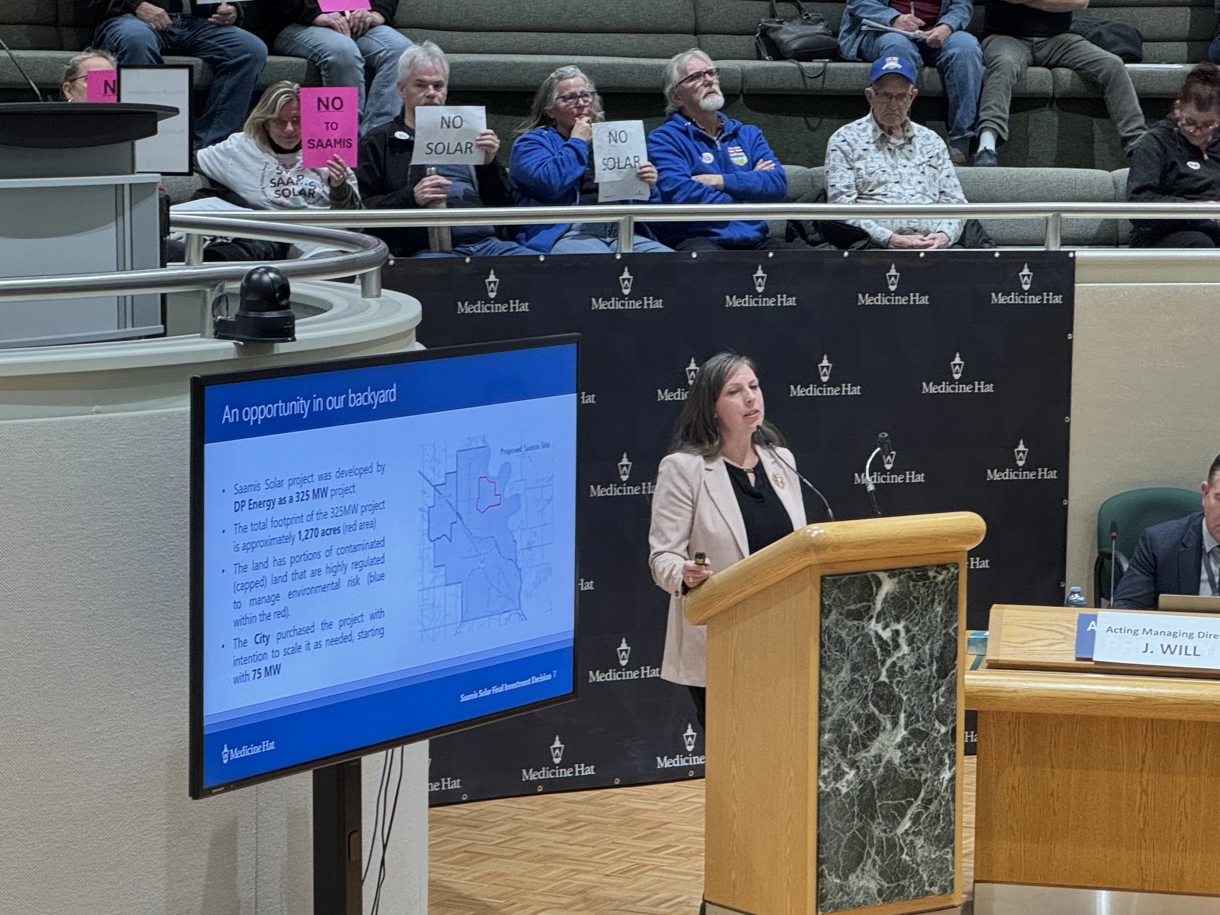 Head of the City of Medicine Hat’s energy division, Rochelle Pancoast, presenting to council background on the Saamis Solar project on Monday Feb. 2, 2026.