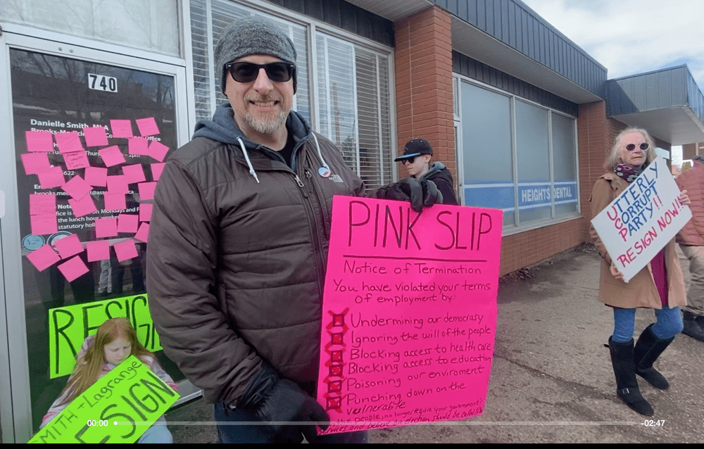 Protesters outside Premier Danielle Smith’s Medicine Hat constituency office. (File photo)