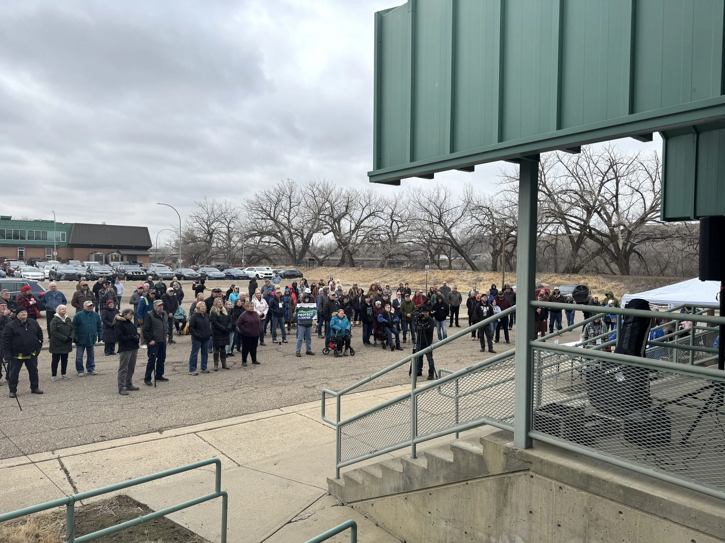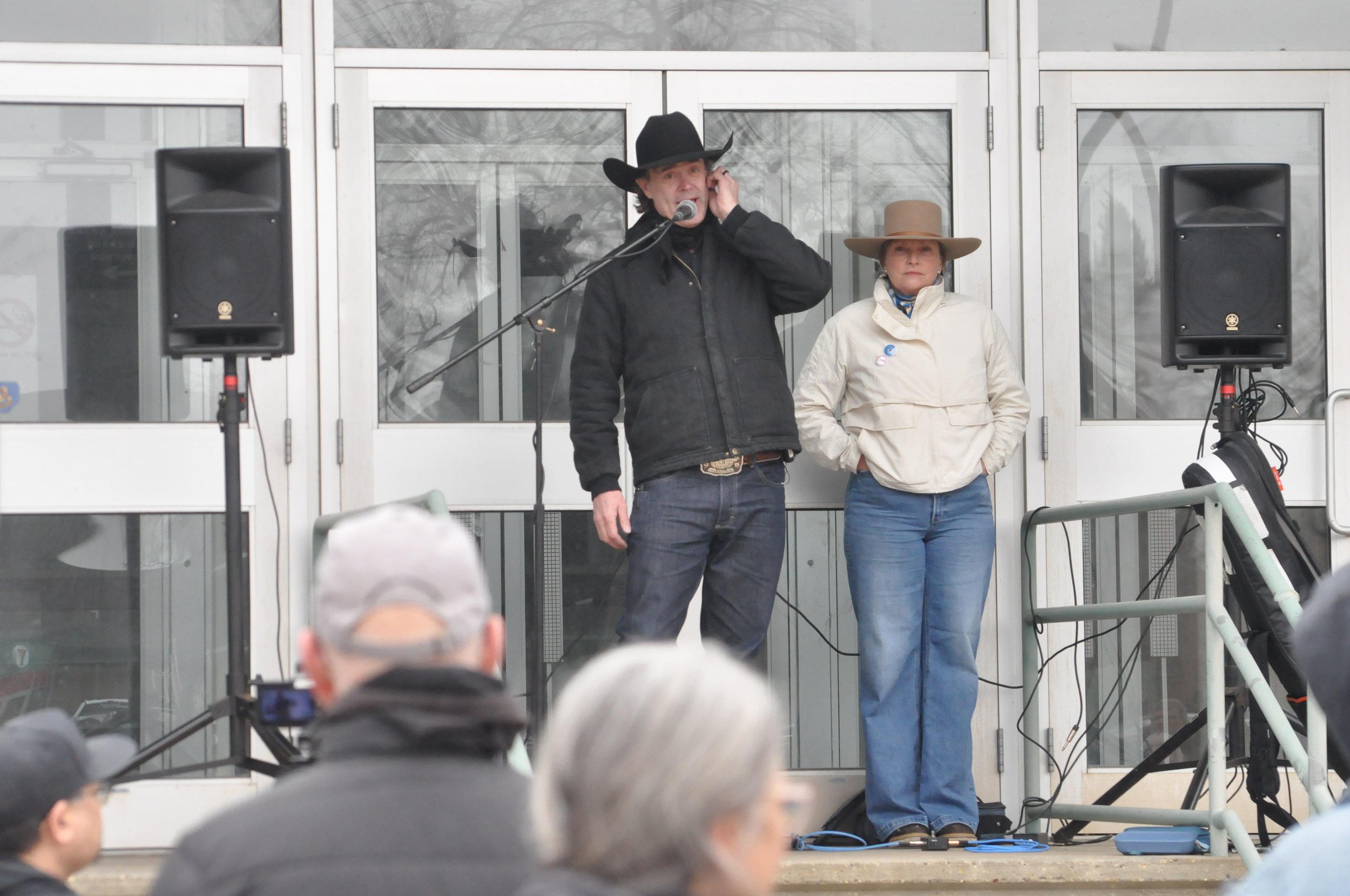 Alberta country musician Corb Lund speaks to a Medicine Hat crowd of around 150 outside the Arena on Sunday. (Photo Alex McCuaig)
